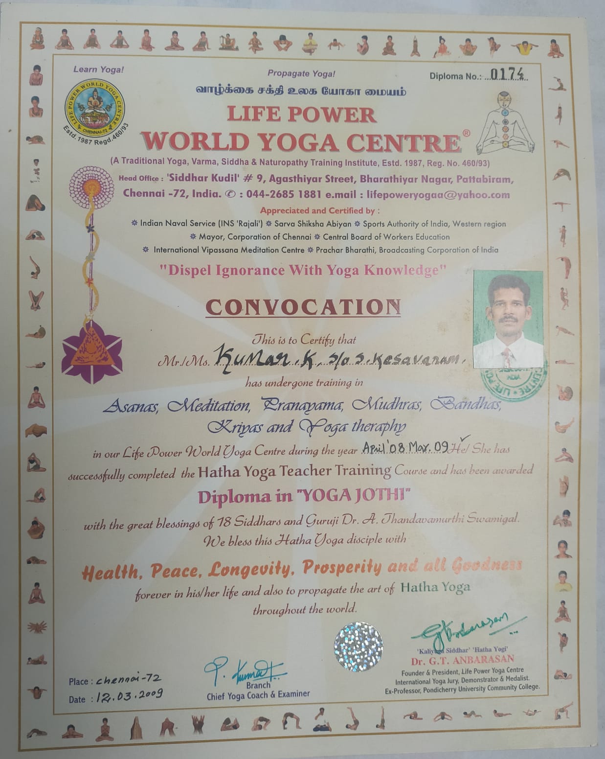 In the year 2008, through one of our students Mr.Aravindhan, I joined Vedhathri Maharishi’s Yoga/Thiayana Centre and got training upto Brahmma Gnyani Course. I got trained in Teaching Course for one year from Hatha Yogi Kaliyuga Siddhar Dr.G.T.Anbarasu. All the above courses and training enlightened me to a little bit which made me to invent in an exclusive way – the POWER YOGA though which ASANAS are founded and implemented.
